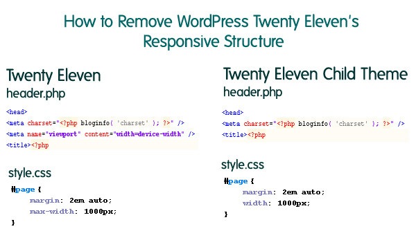 Here’s a snapshot of Twenty Eleven’s code and the child theme’s code that removes the responsive structure.